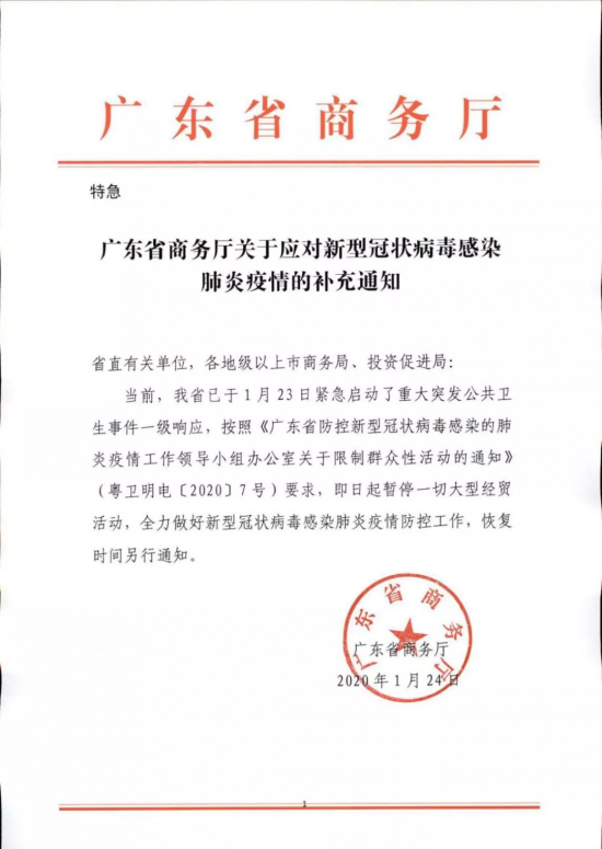 1、《廣東省商務(wù)廳關(guān)于暫停大型經(jīng)貿(mào)活動(dòng)的緊急通知》