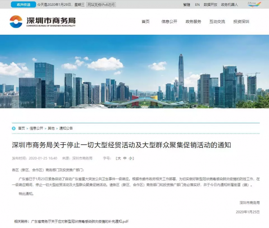 Notice on Suspension of Large-scale Economic & Trade Activities and Large-Scale Mass Promotion Activities by Shenzhen Commerce Bureau