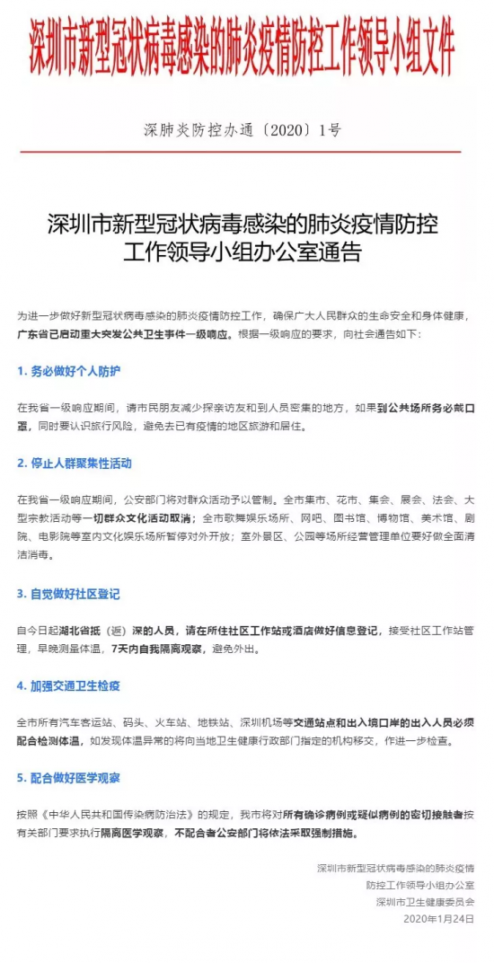 Notice of the Office of the Leading Prevention and Control Group of the Novel Coronavirus-Induced Pneumonia Epidemic in Shenzhen City