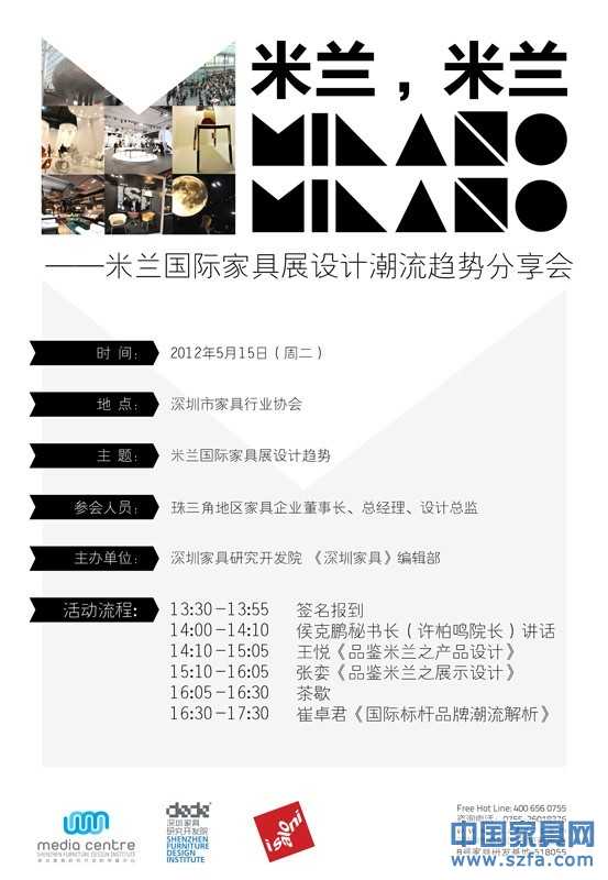 深圳家具研究開發(fā)院聯(lián)合深圳家協(xié)旗下傳媒集團(tuán)于5月15日下午舉行米蘭展分享會(huì),由研發(fā)院3位分析師進(jìn)行產(chǎn)品設(shè)計(jì)、展示設(shè)計(jì)、標(biāo)桿品牌分析等三個(gè)方面的分享,誠邀您的參與!
