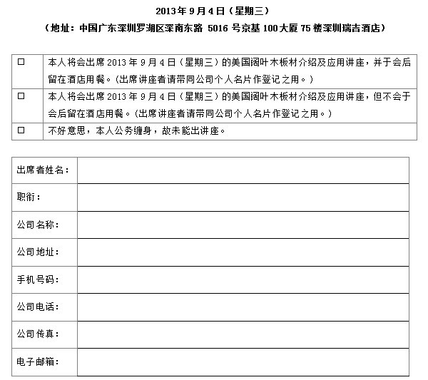 美國闊葉木板材介紹及應(yīng)用講座回執(zhí)