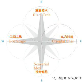 歐洲在北南西東方向的設(shè)計特質(zhì)在當(dāng)代的最新表現(xiàn)可以分別抽象出高雅技術(shù)、視覺博覽、生態(tài)主線和東方時尚等四個關(guān)鍵詞,見圖1所示。
