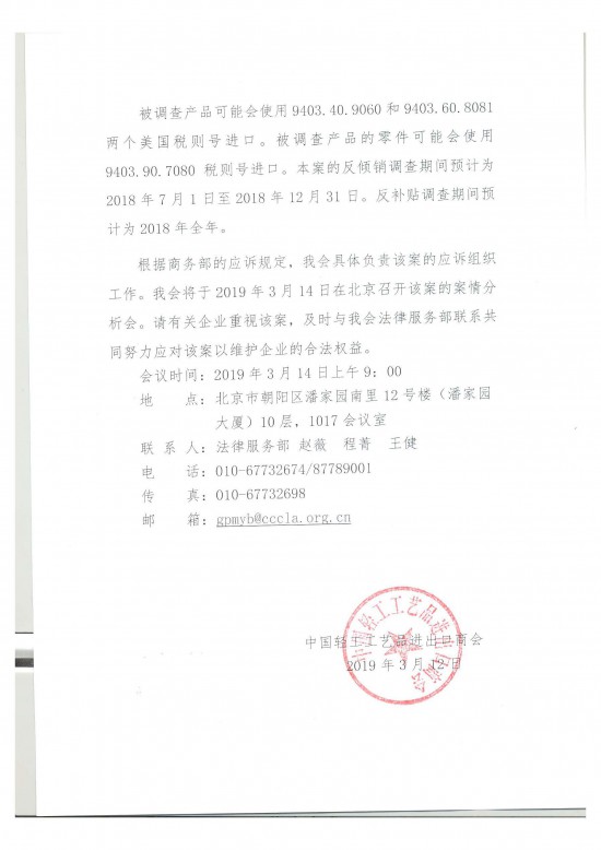 根據(jù)商務(wù)部的應(yīng)訴規(guī)定,我會具體負(fù)責(zé)該案的應(yīng)訴組織工作。我會將于2019年3月14日在北京召開該案的案情分析會。請有關(guān)企業(yè)重視該案,及時與我會法律服務(wù)部聯(lián)系共同努力應(yīng)對該案以維護企業(yè)的合法權(quán)益。