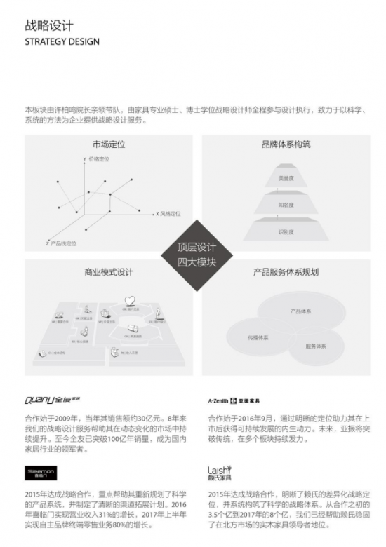 由許柏鳴院長親領(lǐng)帶隊(duì),由家具專業(yè)碩士、博士學(xué)位戰(zhàn)略設(shè) 計師全程參與設(shè)計執(zhí)行,致力于以科學(xué)、系統(tǒng)的方法為企業(yè)提供戰(zhàn)略設(shè)計服務(wù);