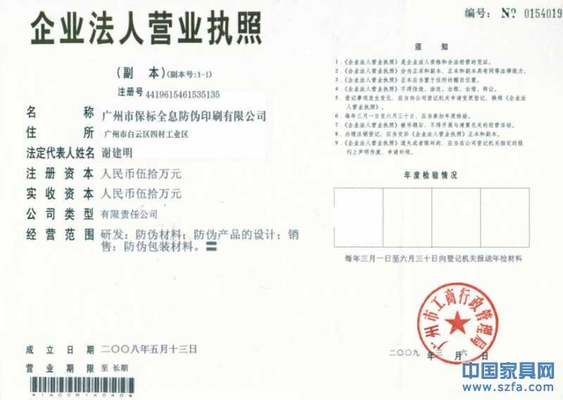 | 發(fā)證機構(gòu): | 工商局 | 發(fā)證時間 : | 2008-05-13 |