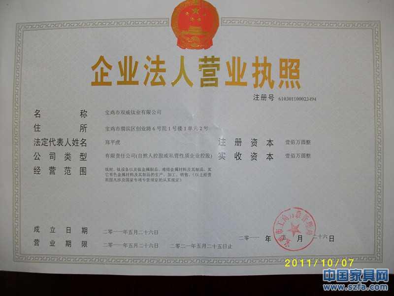 | 發(fā)證機(jī)構(gòu): | 寶雞市工商行政管理局 | 發(fā)證時(shí)間 : | 2011-05-26 |