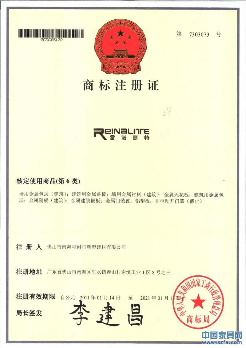 證書介紹 中國雷諾麗特品牌鋁單板,鋁蜂窩板 ,空調保護罩系列產(chǎn)品在全國培育調研推廣活動中,被榮選為《中國著名品牌》并給予重點培育和推廣。其中廣州雷諾麗特五金商行是佛山南??赡蜖栃滦徒ú挠邢薰驹趶V州的分公司。