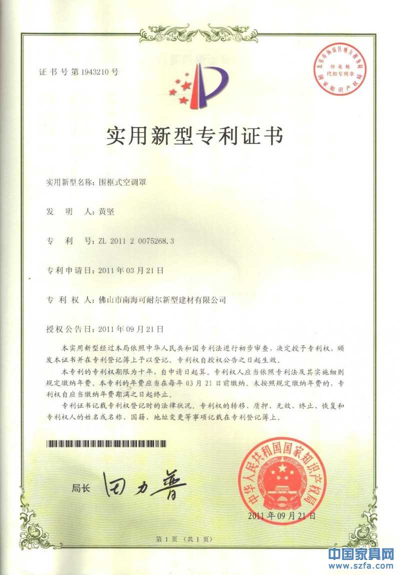 榮譽資質(zhì) 雷諾麗特空調(diào)罩實用新型設(shè)計專利