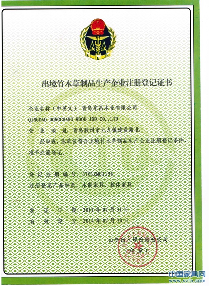 出境竹木草制品生產(chǎn)企業(yè)注冊登記證書
