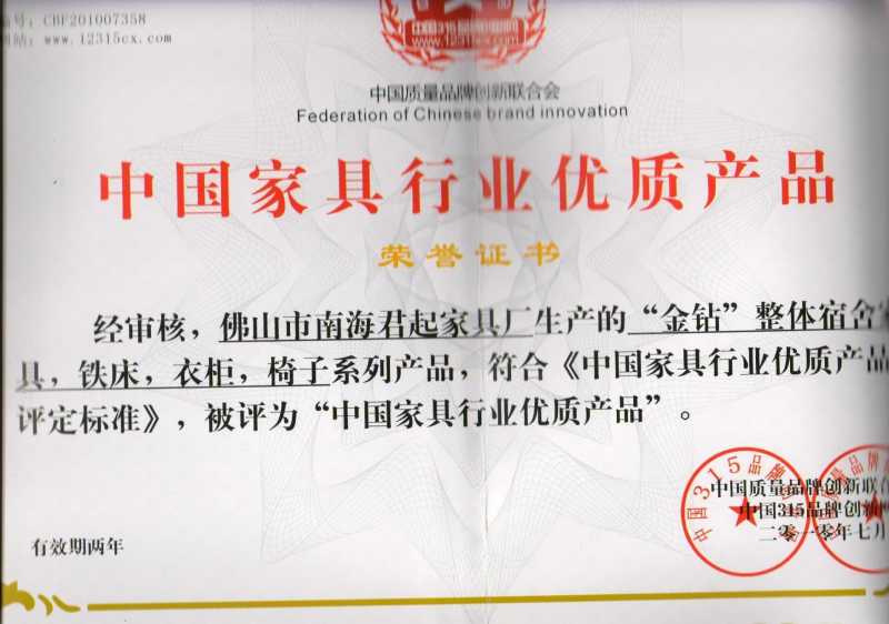 證書介紹 佛山市南海君起家具廠“金鉆”整體宿舍系列產(chǎn)品符合國家優(yōu)質(zhì)產(chǎn)品評定標準,特授予佛山市南海君起家具廠“中國家具行業(yè)優(yōu)質(zhì)產(chǎn)品”榮譽。