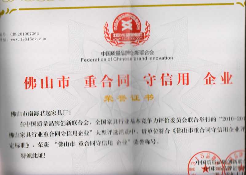 證書介紹 經(jīng)有關(guān)部門聯(lián)合核實,佛山市南海君起家具廠長期以來無違反合同行為,特授予“佛山市重合同 守信用”企業(yè)
