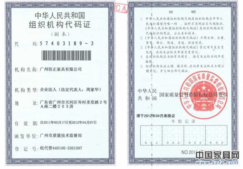 證書(shū)介紹 廣州佰正家具有限公司組織機(jī)構(gòu)代碼證副本 企業(yè)網(wǎng)站:www.gzberthy.com 證書(shū)圖片 |