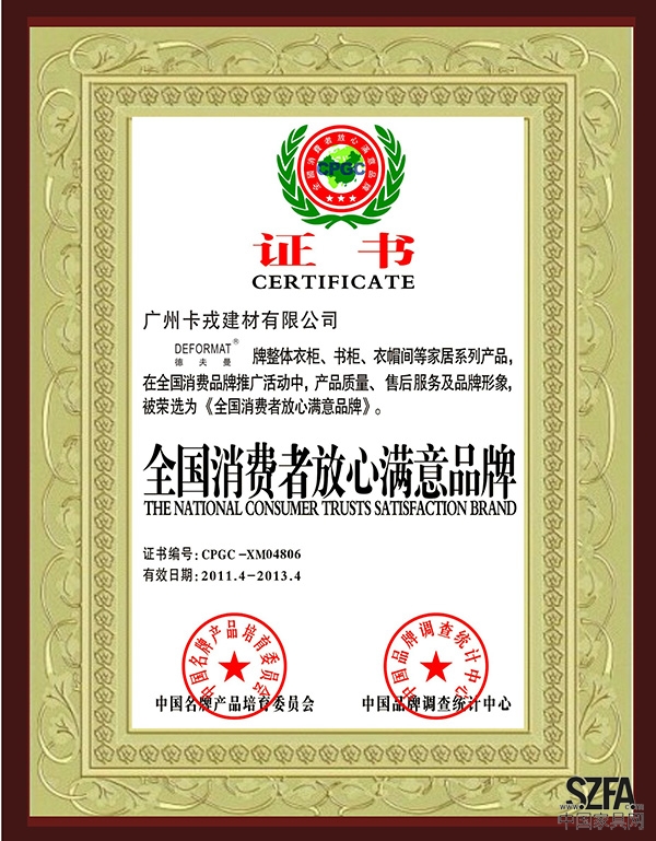 證書介紹 德夫曼衣柜在品牌的推廣之路中,衣柜,衣帽間等產(chǎn)品得到了大眾的認(rèn)可,故被評為全國消費者滿意放心品牌。 證書圖片 |