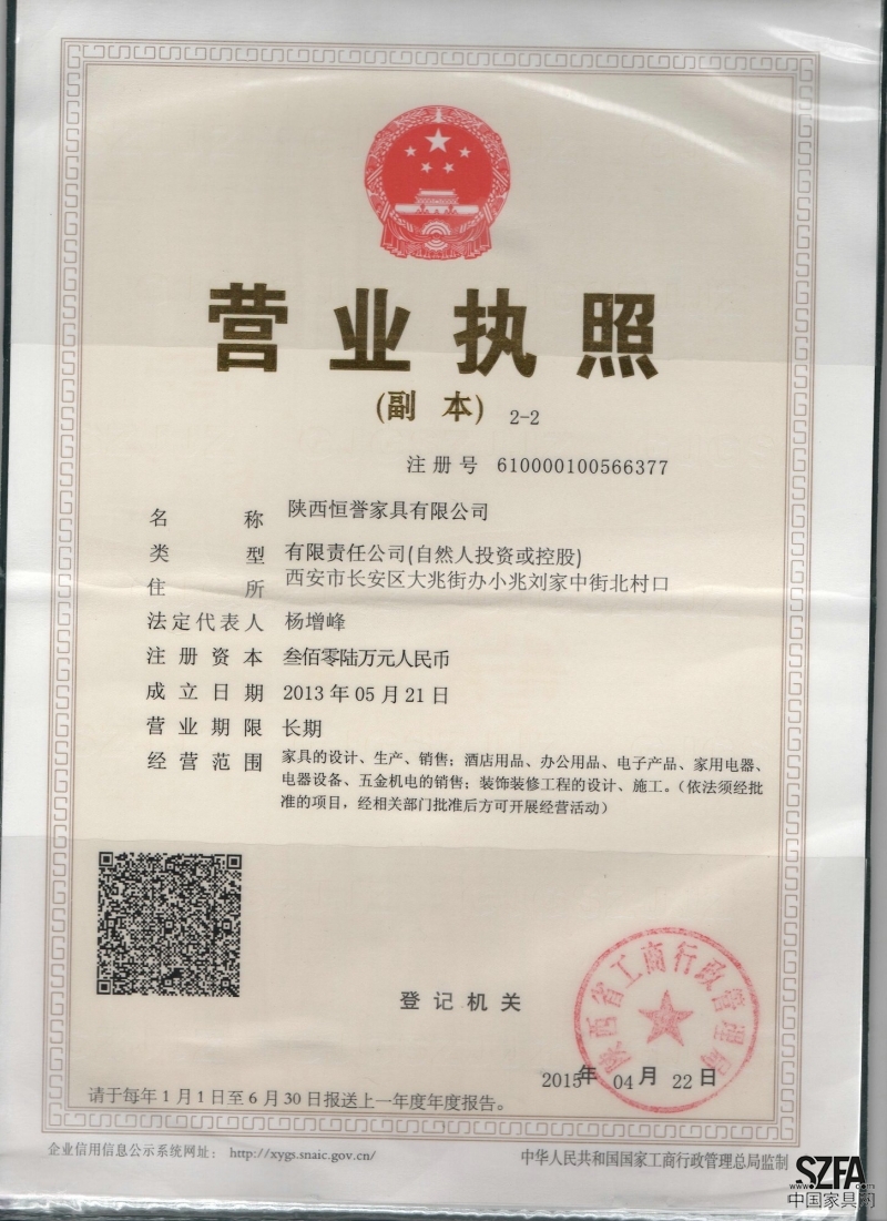 證書介紹 陜西恒譽(yù)家具有限公司是一家集高檔辦公家具、星級酒店家具和校用家具的開發(fā)設(shè)計(jì)、生產(chǎn)及銷售為一體的企業(yè)。