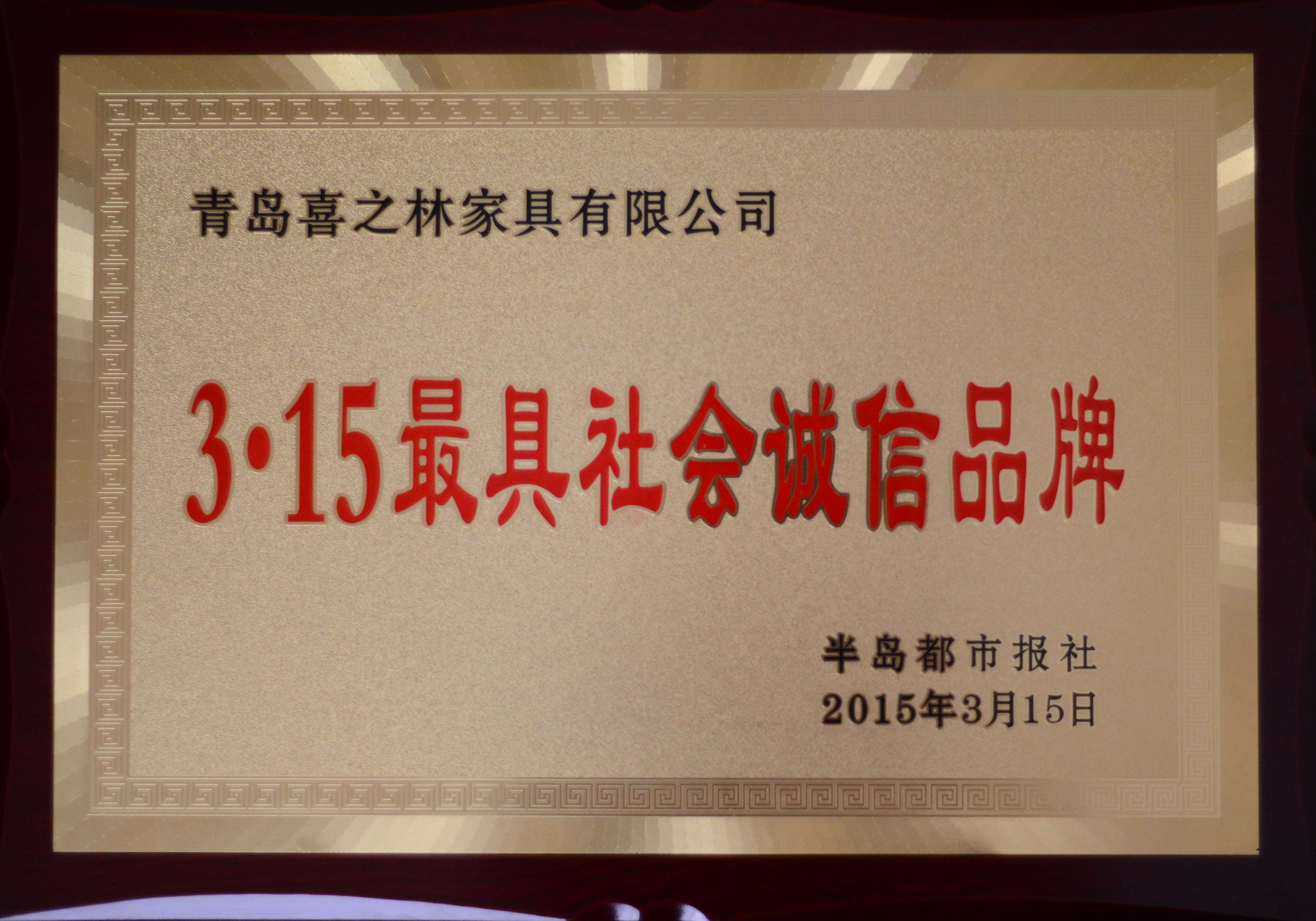 證書介紹 青島喜之林家具有限公司獲得3.15最具社會(huì)誠信品牌