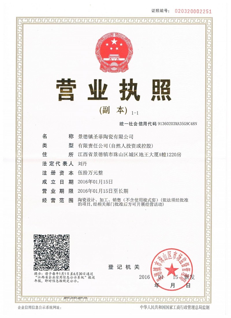 榮譽資質(zhì) 景德鎮(zhèn)圣菲陶瓷有限公司的營業(yè)執(zhí)照