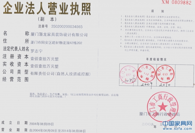 榮譽(yù)資質(zhì) 廈門潘龍家具營業(yè)執(zhí)照