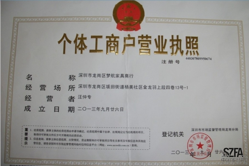 證書介紹 公司名稱:深圳市龍崗區(qū)夢(mèng)航家具商行(原為廣州印象家具有限公司)