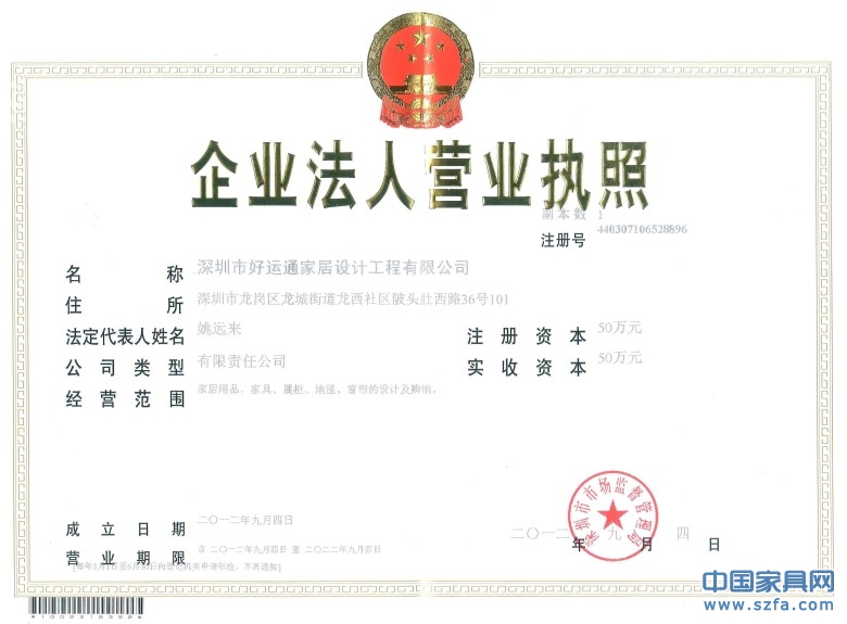 證書介紹 深圳好運通家具設(shè)計工程公司營業(yè)執(zhí)照0755-86326917