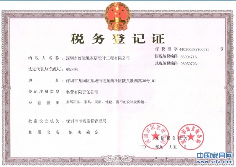 榮譽資質(zhì) 深圳好運通家具設(shè)計工程公司稅務(wù)登記證