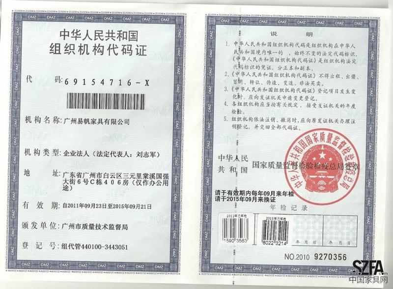 | 發(fā)證機(jī)構(gòu): | 中華人民共和國國家質(zhì)量監(jiān)督檢驗(yàn)檢疫總局 | 發(fā)證時間 : | 2011-09-23 |