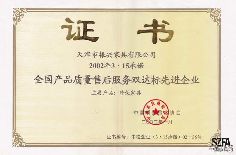 天津市振興家具有限公司 2002年3·15承諾 全國產(chǎn)品質(zhì)量售后服務(wù)雙達(dá)標(biāo)先進(jìn)企業(yè) 主要產(chǎn)品:珍榮家具 中國質(zhì)量檢驗(yàn)協(xié)會 2002年1月 證書圖片 |