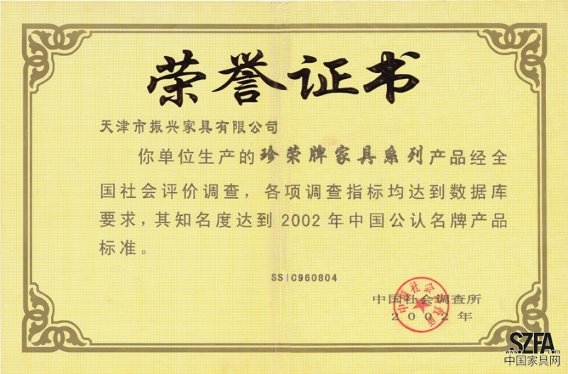 天津市振興家具有限公司 你單位生產(chǎn)的“珍榮牌家具系列”產(chǎn)品經(jīng)全國社會評價調(diào)查,各項調(diào)查指標均達到數(shù)據(jù)庫要求,其知名度達到2002年中國公認名牌產(chǎn)品標準。 中國社會調(diào)查所 2002年 證書圖片 |