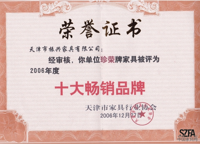天津市振興家具有限公司: 經(jīng)審核,你單位“珍榮”牌家具被評為2006年度“十大暢銷品牌” 天津市家具行業(yè)協(xié)會 2006年12月27日證書圖片 |