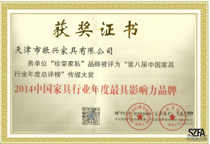 證書介紹 天津市振興家具有限公司 貴單位“珍榮家私”品牌被評為“第八屆中國家具行業(yè)年度總評榜”傳媒大獎(jiǎng)“2014中國家具行業(yè)年度最具影響力品牌” 中國家具產(chǎn)業(yè)品牌聯(lián)盟 中國家具行業(yè)年度總評榜組委會(huì)證書圖片 |
