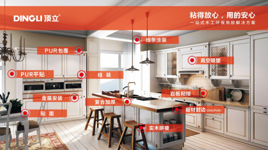 頂立主營水基膠粘劑、PUR膠粘劑、EVA膠粘劑,已有1300多種單品應(yīng)用于全屋定制、木門窗、實木家具、板式套房/辦公家具、吊頂墻板、木制工藝品、板材加工、建筑裝修、印刷包裝等行業(yè),涵蓋生產(chǎn)過程中如PUR平貼、PUR包覆、PUR封邊、拼板組裝、復(fù)合加厚、貼面貼皮、真空吸塑、金屬安裝、巖板粘接、封箱裱糊等各大工藝,為全球10000多家木制品企業(yè)帶去環(huán)保粘合解決方案。