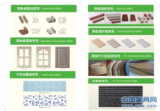 家具配套材料:主要產(chǎn)品有:同色包覆線條、同色包覆鋁型材、同色PVC膜、同色吸塑門板、同色百葉門、同色封邊條、坑槽板及各種款型腰線等。同色線條系列:2745×72和2745×54羅馬柱、2440×36和2440×27柱頭線、72×72~54×54羅馬柱頭、2745×75歐式頂線、2745×72歐式底線、2745×72修邊線。同色鋁型材系列:三款4.8米豎框和6米的有:上軌、下軌、上方、下方及兩款中方。另:2400×300的有11款不同圖案的腰線、8款不同型號的同色吸塑門板、兩款4×8的坑槽板、4款不同型號長度為2750mm的同色百葉和各種規(guī)格的封邊條。