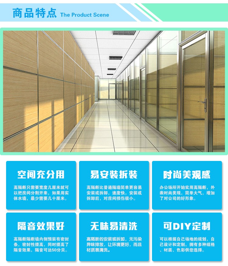 產(chǎn)品采用1.4mm厚鈦鎂鋁合金框架,表面經(jīng)過6次以上氟碳噴涂,不掉色,不褪色,不氧化。本產(chǎn)品環(huán)保,隔音(46db)穩(wěn)固,防火(B級(jí)檢測(cè))美觀,時(shí)尚,組裝式結(jié)構(gòu),利用轉(zhuǎn)角柱靈活轉(zhuǎn)向,合理分隔有限空間,重置利用率高達(dá)90%,實(shí)現(xiàn)真正可以帶走的裝璜。有85和101款,各種各樣的顔色,歡迎來我公司訂購洽談.