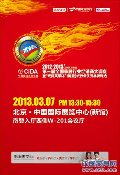 2013年3月7日下午13:30-15:30,2012-2013’第三屆全國家居行業(yè)經(jīng)銷商大調(diào)查暨“紙尚美學”杯墻(壁)紙行業(yè)優(yōu)秀品牌評選頒獎典禮在北京·中國國際展覽中心(新館)W201會議廳隆重舉行,500余名墻紙經(jīng)銷商及廠家代表參加盛會,中國室內(nèi)裝飾協(xié)會領導、房地產(chǎn)業(yè)協(xié)會領導出席典禮并為獲獎品牌頒獎。