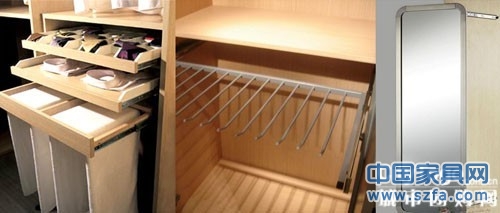 6、看五金,五金是確保衣柜使用舒適度、耐用度的重要指標(biāo),選購(gòu)和驗(yàn)收時(shí)要仔細(xì)去推拉感覺。專業(yè)廠家采用名廠配件,有質(zhì)量保證。