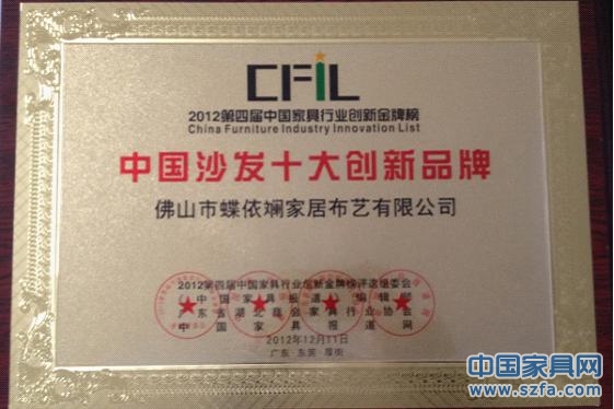 2012年12月11日,由《中國家具報道》發(fā)起,攜手《中國家具報道網》、《中國家具論壇網》聯(lián)合主辦的2012第四屆中國家具行業(yè)創(chuàng)新高峰論壇暨創(chuàng)新金牌榜頒獎典禮在東莞盛大舉行,來自全國家具行業(yè)的數(shù)百精英聚集一起共商家具業(yè)創(chuàng)新發(fā)展之策,廣東蝶依斕沙發(fā)繼2009年、2011年被評為中國沙發(fā)十大創(chuàng)新品牌后再次上榜“中國沙發(fā)十大創(chuàng)新品牌”。