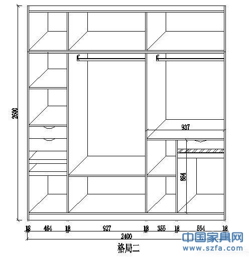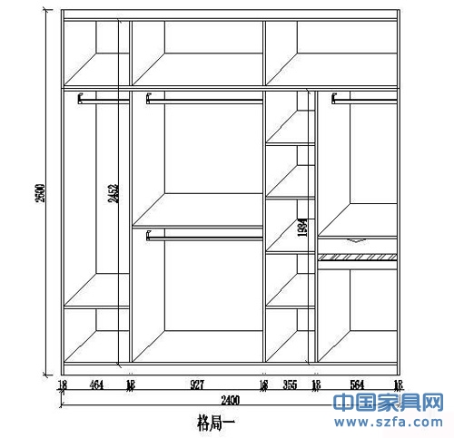 下面我們用一個(gè)長(zhǎng)2400mm、高2600mm的衣柜來(lái)舉例不同的衣柜格局其價(jià)錢是多少作為參考,分別將衣柜設(shè)計(jì)兩個(gè)不同的格局,格局
