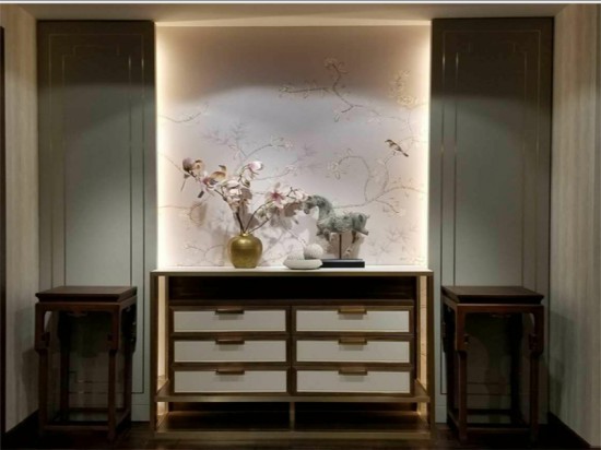 新中式玄關(guān)設(shè)計(jì),以簡(jiǎn)約的功能性家具作為主體,力求自然而不事雕琢,在少量的古典裝飾元素里,適當(dāng)融入時(shí)尚大氣的現(xiàn)代設(shè)計(jì)語(yǔ)言,再搭配掛畫、器物、禪意花瓶等,來(lái)牽引出無(wú)限的空間想象。山水、枯枝、松柏、梅花,當(dāng)自然界最有意境的事物聚在一起 ,便給玄關(guān)增添了幾分韻味,幾分回歸大自然的清新之感。打造出展現(xiàn)現(xiàn)代東方美學(xué),氣質(zhì)脫俗,雅致優(yōu)美的意境。
