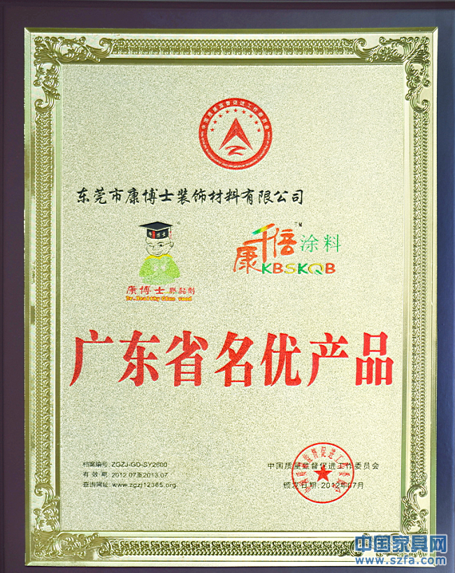 繼三月份我公司榮獲AAA+級中國質量信用企業(yè)、四月份榮獲消費者最信賴質量放心品牌、五月份“多功能液體木膠粉”榮獲國家專利榮譽之后,六月份我公司旗下品牌“康博士膠黏劑”、“康千倍涂料”經過嚴格審核后又被中國質量監(jiān)督促進工作委員會列入廣東省名優(yōu)產品之列。