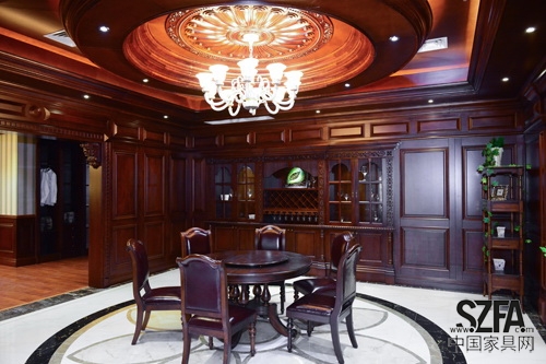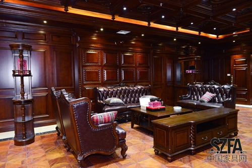 四壁墻板,厚重木門,精巧樓梯,都是北美、非洲進(jìn)口的貴重楠木精工制作,柔軟的沙發(fā)、寬邊的壁櫥與裝飾氛圍相得益彰,顯現(xiàn)后歐洲現(xiàn)代風(fēng)格。碩大的羅馬柱頭對(duì)稱的雕花穩(wěn)重端莊,