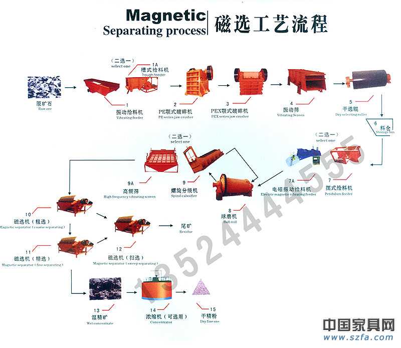 鐵礦選礦設(shè)備,開采的礦石先由顎式破碎機(jī)進(jìn)行初步破碎,在破碎至合理細(xì)度后經(jīng)由提升機(jī)、給礦機(jī)均勻送入球磨機(jī),由球磨機(jī)對(duì)礦石進(jìn)行粉碎、研磨。經(jīng)過(guò)球磨機(jī)研磨的礦石細(xì)料進(jìn)入下一道工序:分級(jí)。螺旋分級(jí)機(jī)借助固體顆粒的比重不同而在液體中沉淀的速度不同的原理,對(duì)礦石混合物進(jìn)行洗凈、分級(jí)。經(jīng)過(guò)洗凈和分級(jí)的礦物混合料在經(jīng)過(guò)磁選機(jī)時(shí),由于各種礦物的比磁化系數(shù)不同,經(jīng)由磁力和機(jī)械力將混合料中的磁性物質(zhì)分離開來(lái)。經(jīng)過(guò)磁選機(jī)初步分離后的礦物顆粒在被送入浮選機(jī),根據(jù)不同的礦物特性加入不同的藥物,使得所要的礦物質(zhì)與其他物質(zhì)分離開。在所要的礦物質(zhì)被分離出來(lái)后,因其含有大量水分,須經(jīng)濃縮機(jī)的初步濃縮,再經(jīng)烘干機(jī)烘干,即可得到干燥的礦物質(zhì)。