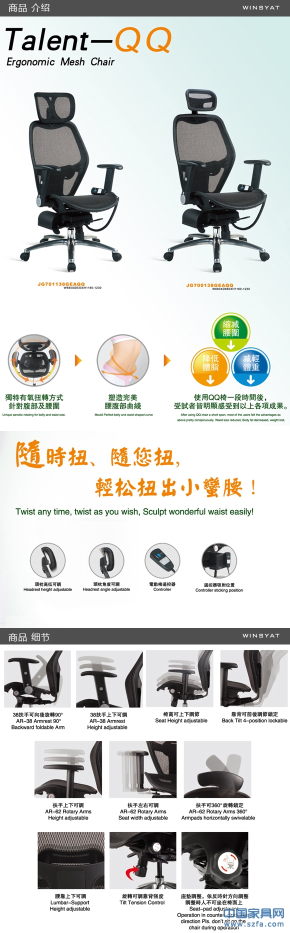 尼龍座背塑外殼+進(jìn)口網(wǎng)布+頭靠、旋轉(zhuǎn)式可調(diào)扶手(含多國(guó)專利)。