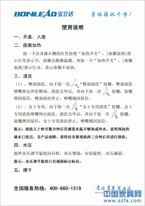 寶立達電子潔身器讓您在每次如廁時都感受到溫水沖洗的快感,而且從此不再有不干凈的內(nèi)衣、不再有痛苦的便秘、不再有難聞的異味、不再有痔瘡、不再浪費更多手紙!