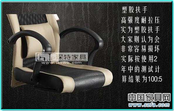 3 .椅子扶手:材質為PA+纖,強度比PP材質高出3倍,扶手表面加裝高彈性定型海綿,手感超柔舒適,大大減緩肘部壓力;(該扶手表面為汽車油漆處理,極為高檔和豪華)