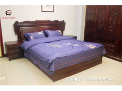 床頭柜上下兩個抽屜,與床箱雕刻相統(tǒng)一,手工打磨的元寶型凹槽拉手,