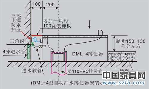 安裝條件:1.進水管:4分(¢20)普通水管;2.污水排出管:¢110 普通PVC管;3.220V明裝或暗裝三眼插座。
