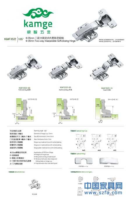 產(chǎn)品類型:105° Ф35mm兩段力固定式靜音鉸鏈
