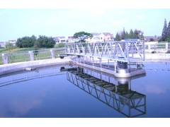 工作橋由安裝在周邊的驅動機構帶動,繞安裝在池中心支墩上的中心支座旋轉,安裝在工作橋上的一組刮泥板在旋轉過程中,將沉淀在池底部的污泥刮向池中心的積泥坑。同時,液面上的浮渣在浮渣刮板和周邊擋渣堰形成的漸縮區(qū)域內集中,有浮渣刮耙扒到集渣斗,排至池外。