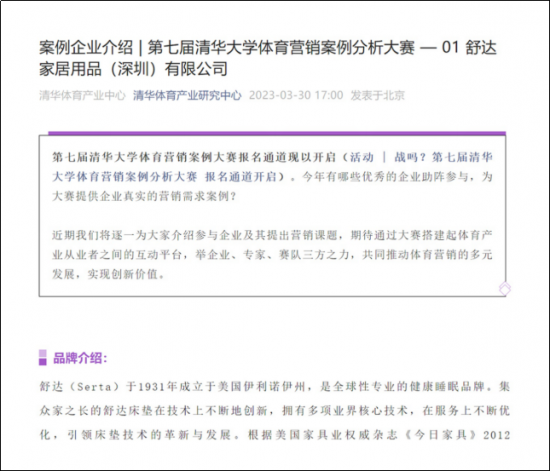 核心提示:2023年3月,舒達(dá)床墊成功入選2023年第七屆清華大學(xué)體育營(yíng)銷案例分析大賽案例企業(yè)。