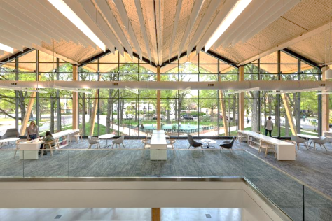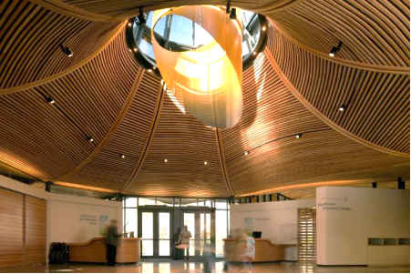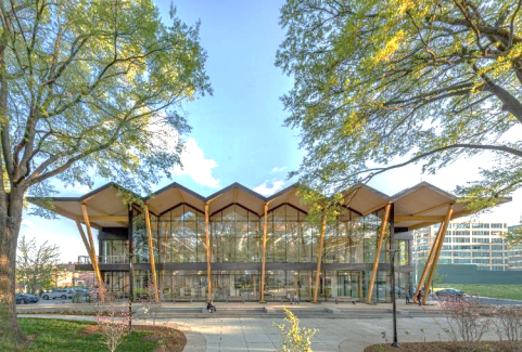 在華盛頓特區(qū)完成的公共圖書館項目就是一個實現(xiàn)了藝術(shù)、實用和成本三足鼎立的優(yōu)秀作品。該項目位于市中心,毗鄰一個城市公園,為了讓圖書館與公園之間建立強烈的聯(lián)系,圖書館的頂部被設(shè)計為一個巨大的木制天篷,猶如城市公園中樹冠的延伸。