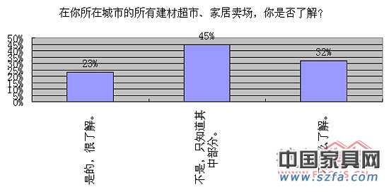 隨著家居建材以及裝飾裝修市場在近年來的不斷擴張,包括上海、杭州、南京等地在內(nèi)的華東省市更迎來一股明顯的家居賣場擴張潮。從小區(qū)門口的家具店、五金建材店,到當(dāng)?shù)乇就两ú某械臒峄?、全國大型連鎖賣場的洶涌來襲,再到跨國資金國外賣場品牌的入駐……讓人眼花繚亂的同時,消費者的選擇也越來越多。面對這一變化,消費者對自己所在城市的所有建材超市、家居賣場,究竟了解多少?截至2011年2月23日下午15點14分,共有348位網(wǎng)友參與調(diào)查,網(wǎng)友所在區(qū)域主要覆蓋上海、杭州、南京,以及江浙周邊的華東城市。從投票結(jié)果可以看出,雖然賣場擴張速度快,擴張步伐大,但是對于普通消費者而言,他們的關(guān)注范圍還比較有限。45%的網(wǎng)友表示只知道其中部分,32%的網(wǎng)友表示不怎么了解,僅23%的網(wǎng)友表示自己很了解。而在日前,搜狐記者前往紅星美凱龍滬南店實地考察時,某家具品牌門店負(fù)責(zé)人這樣告訴記者,開業(yè)以來,到店里的消費者90%是浦東當(dāng)?shù)氐?,另?0%從其他地區(qū)過來的,其中大部分也都住在浦西中環(huán)附近距離該門店車程比較方便的地方。由此不難看出,地域性對于消費者對當(dāng)?shù)亟ú某小⒓揖淤u場的認(rèn)識起到不小的作用。